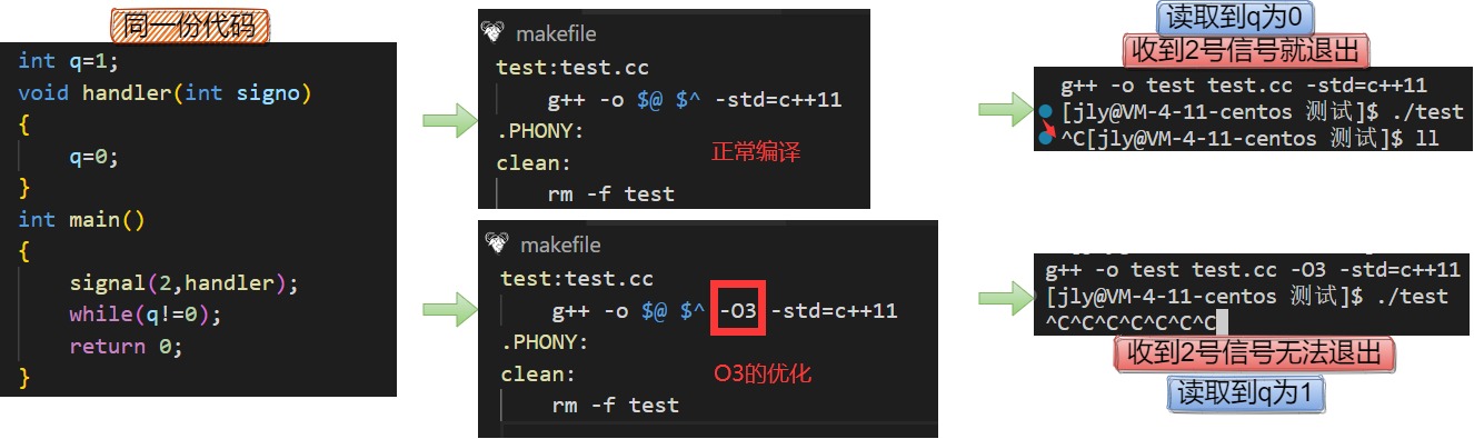 O3优化时:编译器认为q在main执行流中没有被修改,所以编译器对q做了优化,直接将q放在了寄存器中,这样后续执行时就不用再去内存中读取q了,提高了程序运行效率。虽然handler中修改了内存中的q,但是寄存器中的q值一直是1(寄存器中的q值是临时值,操作系统没有对其进行修改),所以会发生上图效果。