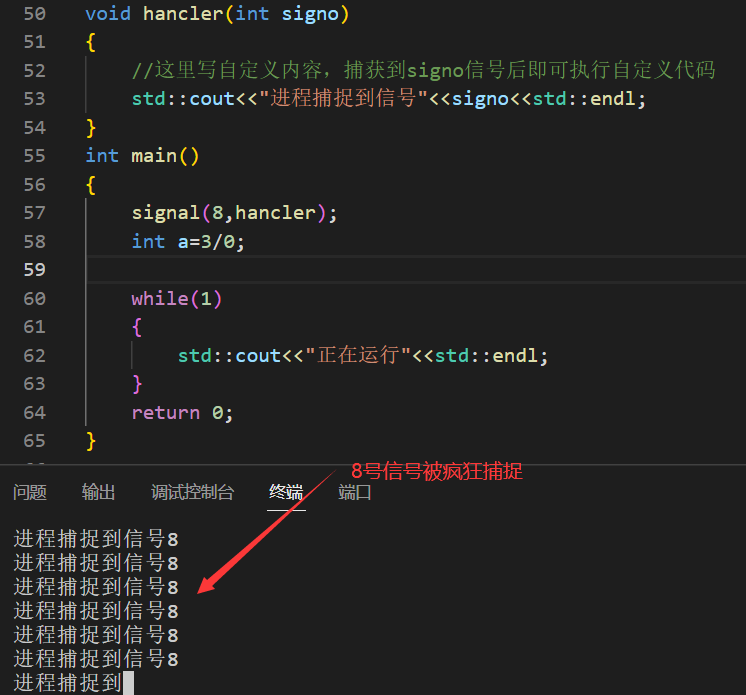 此时使用signal()捕捉这个信号,就会发现8号信号一直在被捕捉。这是因为状态寄存器是由CPU进行维护的,当8号信号被捕捉,进程并没有退出,根据时间片轮转,当进程被切换/剥离至CPU时,会读取和保存当前寄存器的上下文信息,所以我们就看到了8号信号被死循环捕捉。