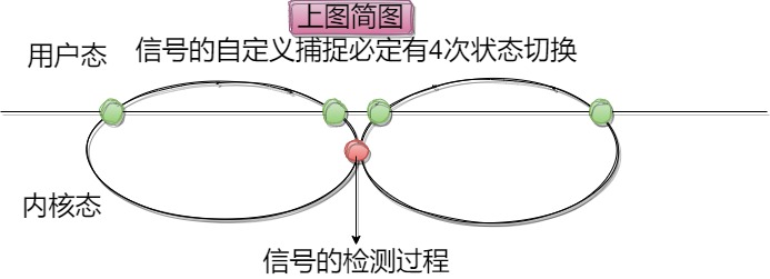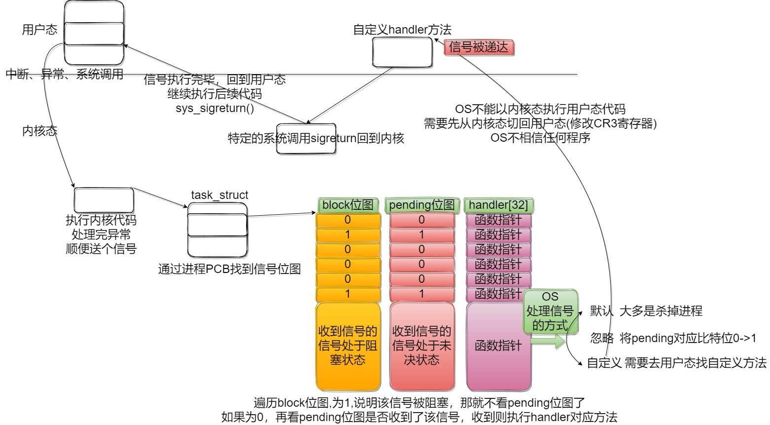 若为自定义处理,则需要进程回到用户态去执行用户设定的handler方法。为什么进程不能以内核态的身份直接执行handler方法?这是因为进程处于内核态,权限非常高,操作系统是没有能力识别代码的逻辑的,若handler被人为植入恶意代码,原先部分没有权限的代码因为执行身份的变化而被提权,所以操作系统必须让进程先回到用户态,降低进程的权限。