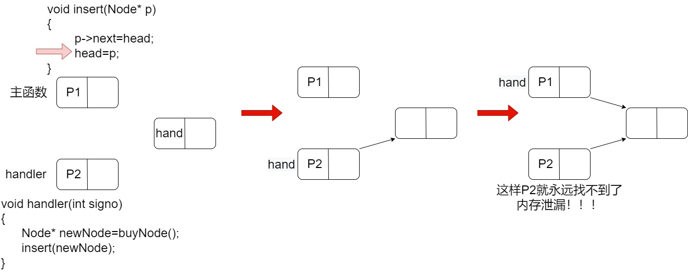 main函数调用insert函数向一个链表head中插入节点P1,插入操作分为两步,刚执行完第一句代码,此时硬件中断使进程切换到内核,再次回用户态之前检查到有信号待处理,于是切换到sighandler函数,sighandler也调用insert函数向同一个链表head中插入节点node2,插入操作执行完毕后,sighandler返回内核态,再次回到用户态就从main函数继续执行刚才剩余的代码。结果是,main函数和sighandler先后向链表中插入两个节点,而最后只有P1真正插入链表中,P2这个节点谁都找不到了。发生内存泄漏。