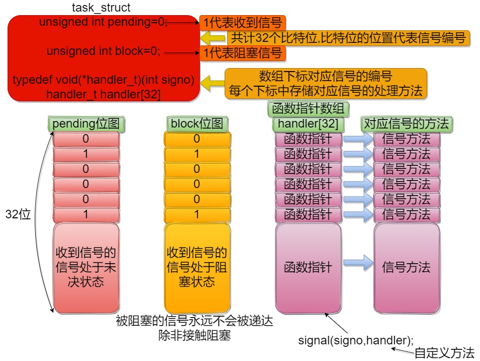 以普通信号为例,进程task_struct结构体中存在unsigned int signal变量用以存放普通信号。(32个比特位中使用0/1存储、区分31个信号——位图结构)