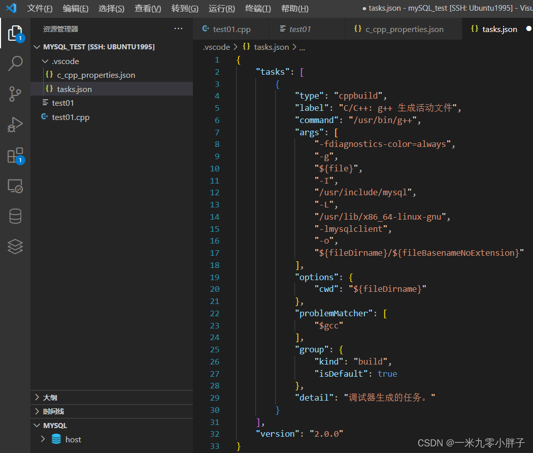 tasks.json为编译器相关的配置文件,用于生成可执行文件。当工程涉及到多个源文件时,使用Makefile文件更加方便,其使用教程见:https://blog.csdn.net/weixin_47156401/article/details/121698316