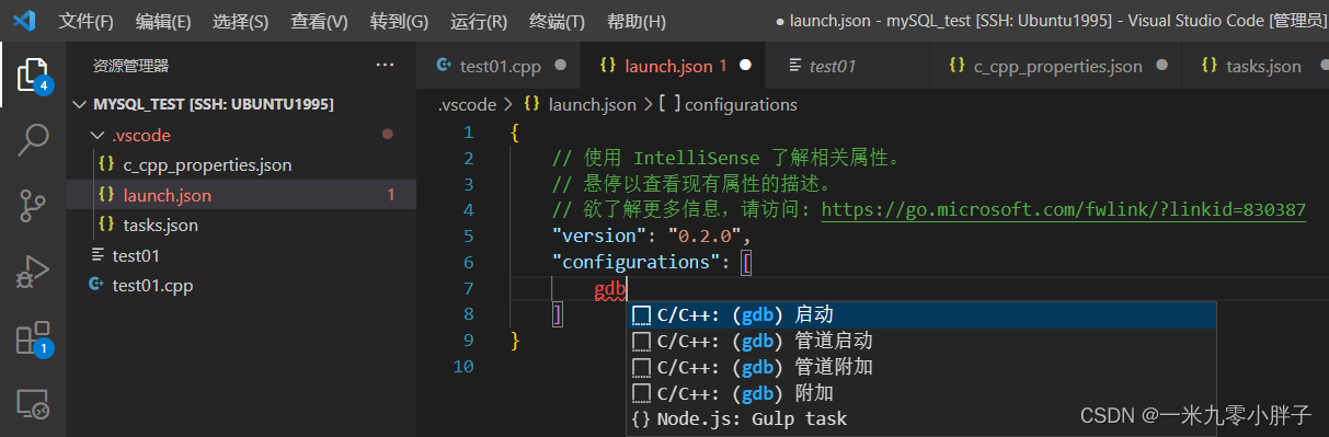 然后在“configurations”中输入“gdb”,并点击“C/C++:(gdb)启动”,可以自动生成默认配置。一般,修改默认配置中的"program"和"miDebuggerPath"即可完成绝大部分的设置,其说明如下: