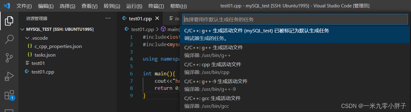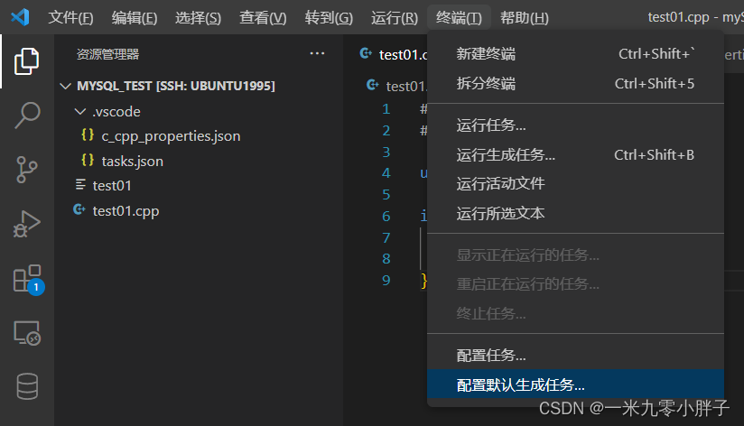点击菜单栏中的“终端”—>“配置默认生成任务”—>"C/C++:g++生成活动文件",如下图所示: