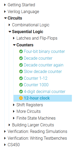 这是HDLBits的电路->时序逻辑->计数器问题的压轴大题,如果没有从头开始刷起,直接刷12-hour clock对我这种初学者来说是非常吃力的。从这可以看出HDLBits网站出题人的用心良苦,他想告诉我们硬件初学者的是对于复杂的问题不要害怕,复杂的问题是由一个一个简单的小问题组成的,要有将复杂大问题(module)分解成一个一个简单小问题(sub-module)的能力。