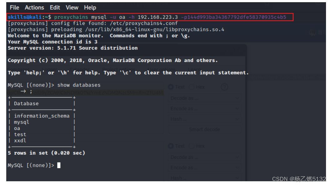 proxychains mysql -u oa -h 192.168.223.3 -p144d993ba34367792dfe58370935c4b5