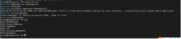3.于是重新运行start-all.sh文件,并且最后通过自己的jps命令,成功验证了自己的jps伪分布式集群