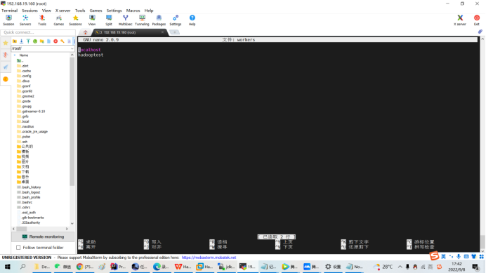 (6)绑定主机名,用hostname先查看自己的主机名,然后nano workers绑定自己的主机名。