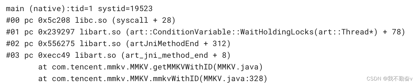 使用了MMKV 代替了 原生 SP ,java.io.FileDescriptor.sync (FileDescriptor.java) 的ANR 问题消失了,但是又有了新的堆栈?真头疼。并且这个问题有人在MMKV github 上提过issue:ANR in MMKV · Issue #454 · Tencent/MMKV · GitHub,不过没有好的解决方案。