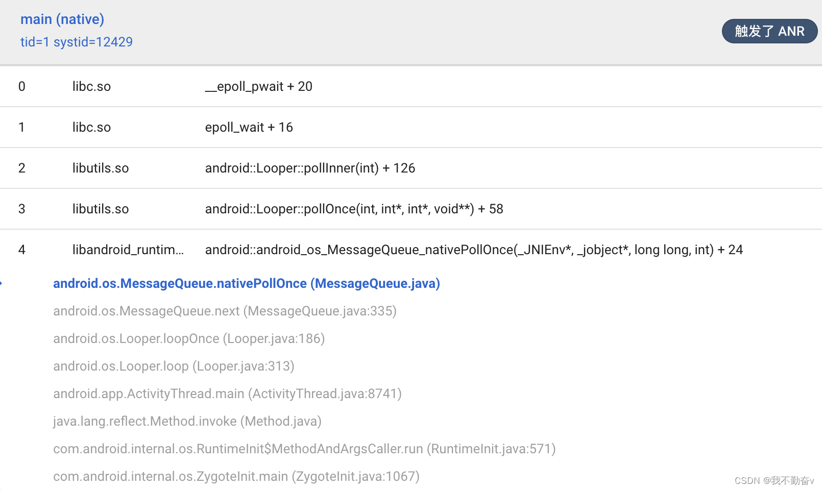 “炸弹爆炸”后,目标进程收到系统进程的 SIGNAL QUIT 信号 开始 Dump 业务堆栈,这个时候目标进程的主线程不耗时间了,主线程 Dump 的是当前某个消息执行过程的业务堆栈。