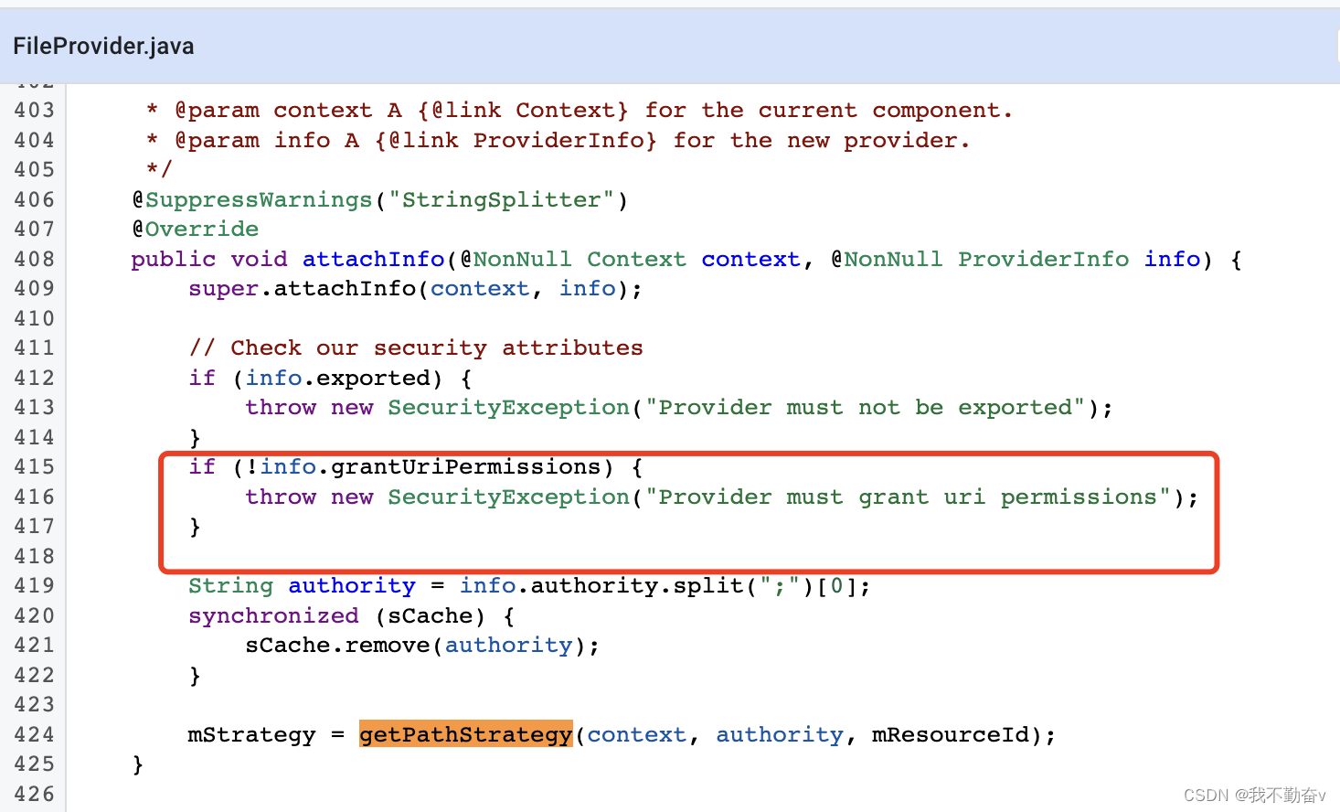 通过查看 FileProvider 源码发现,只要 ProviderInfo的grantUriPermissions为 fasle, 就可以拦截getPathStrategy 的调用。然后后续调用FileProvider的query、openFile、delete等接口前再反射调用 getPathStrategy 。