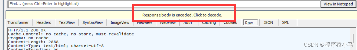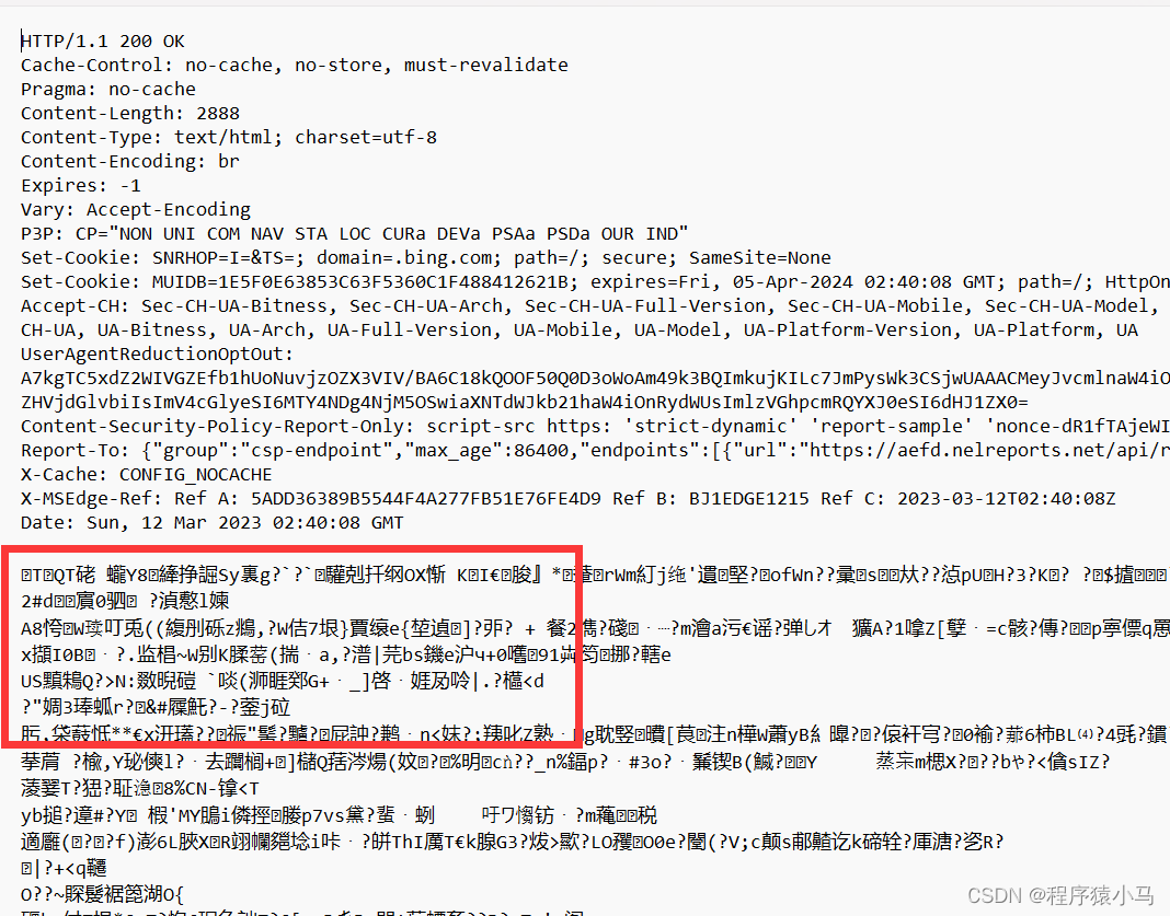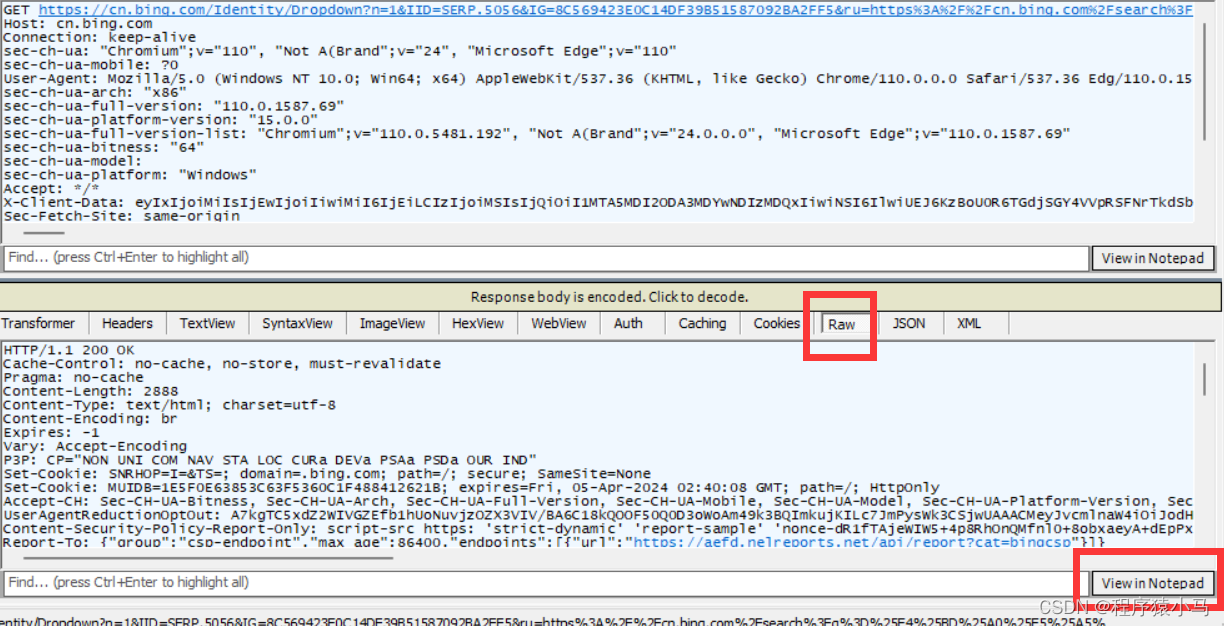 会发现记事本出现乱码.这是因为,响应数据本来也是行文本数据,但是有的服务器会对响应进行压缩,变成二进制的数据了,如果想要观察到行文书数据,点击: