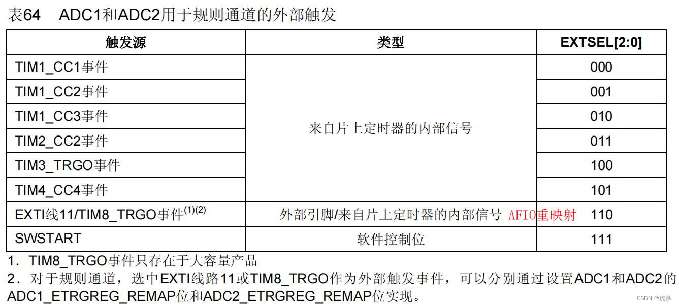 上一小节提到,要想ADC进行转换,还需要完成 触发 这个操作。触发信号可以是 软件触发、硬件触发。软件触发可以由ADC的库函数完成;硬件触发见上图。