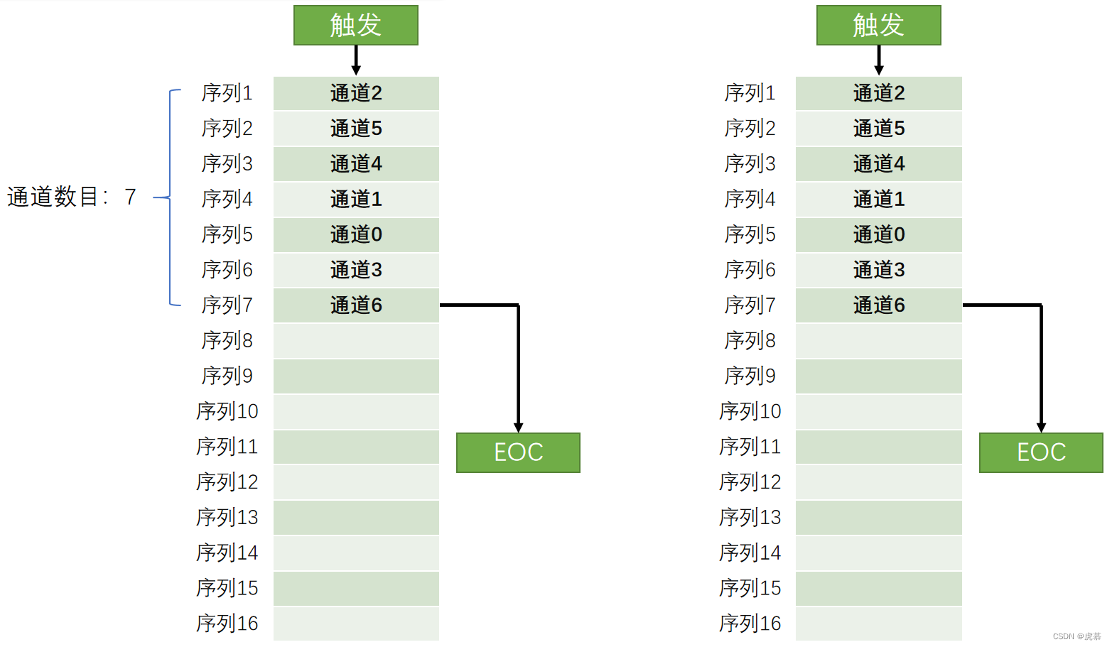 - 如何实现多通道ADC。若使用扫描模式实现多通道ADC,需要考虑数据覆盖的问题。下面是几种实现ADC多通道的思路: