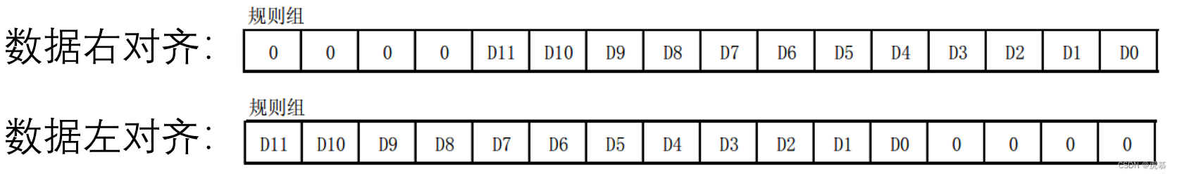 因为ADC是12位的,而寄存器宽度为16位,所有便有了数据对齐方式的选择。