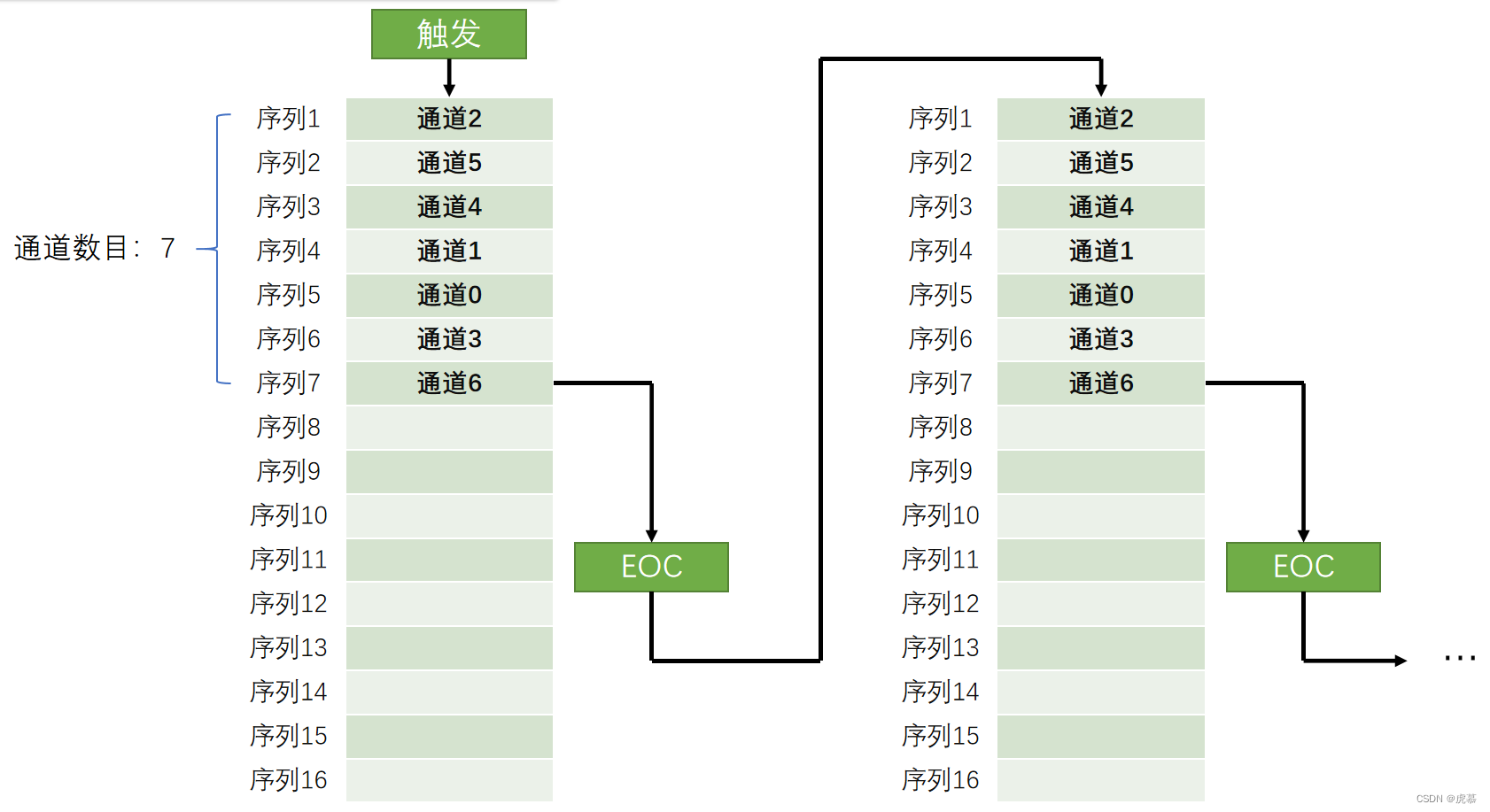 相比于第一种模式,可以一次性转换多个通道,不过还是触发一次、所有通道只转换一次。