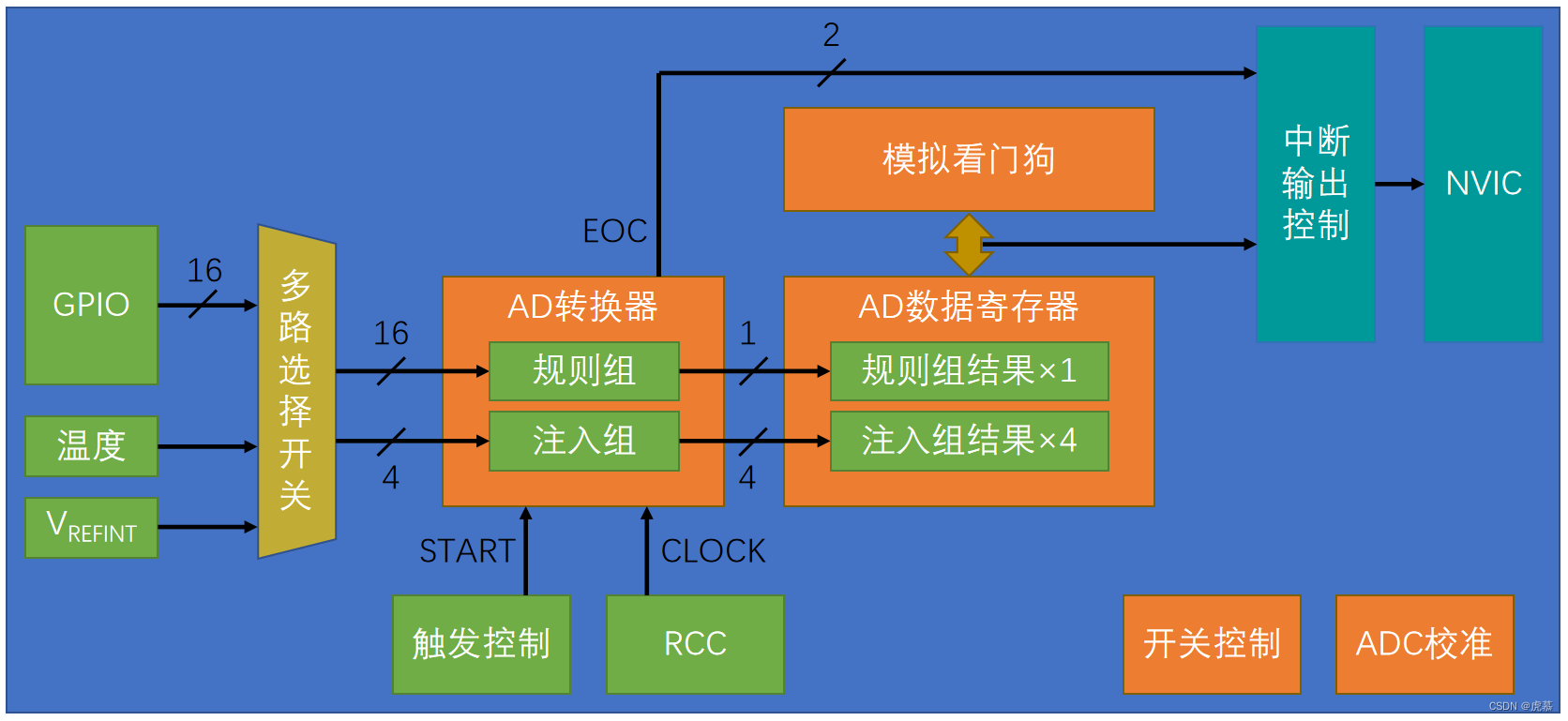 - ADCx_IN0~ADCx_IN15、温度传感器、VREFINT:ADC的16个输入通道。