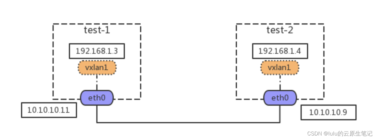 # 即默认vxlan1 对端地址为 10.10.10.9,通过eth0进行报文交换对test-2进行同样的配置,保证VNI和dstport一致。VNI一致是为了不进行vxlan隔离,