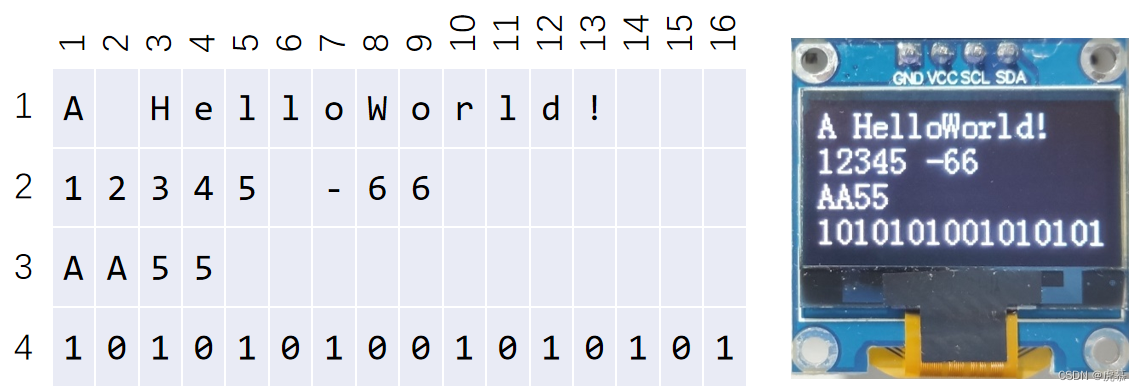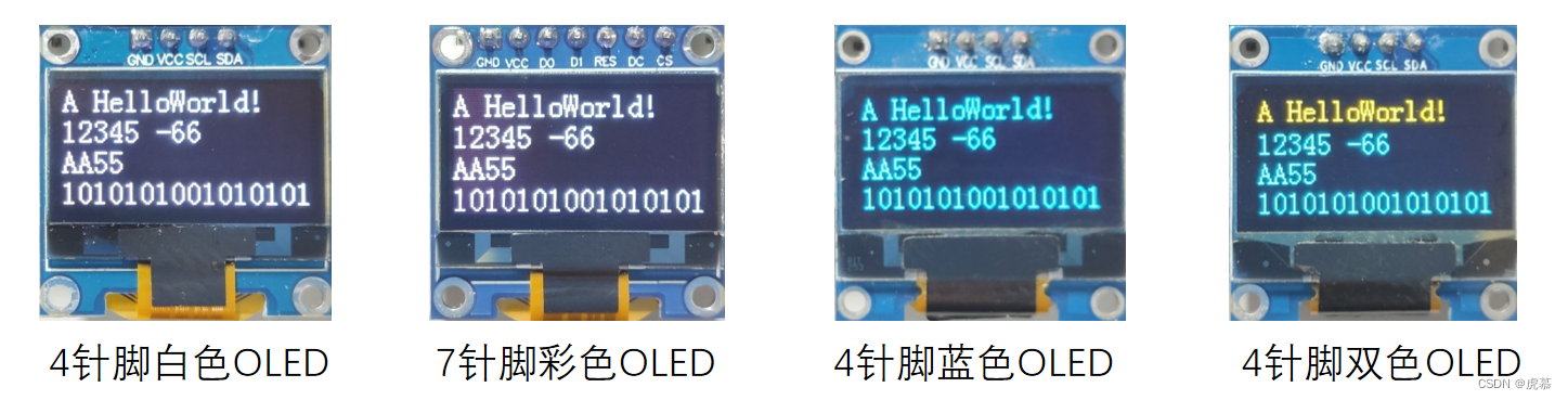 #include "OLED.h"int main(void){OLED_Init();OLED_ShowChar(1,1,'A');OLED_ShowString(1,3,"Hello World!");OLED_ShowNum(2,1,12345,5);OLED_ShowSignedNum(2, 7, -66, 2);OLED_ShowHexNum(3, 1, 0xAA55, 4);OLED_ShowBinNum(4, 1, 0xaa55, 16); while(1){};