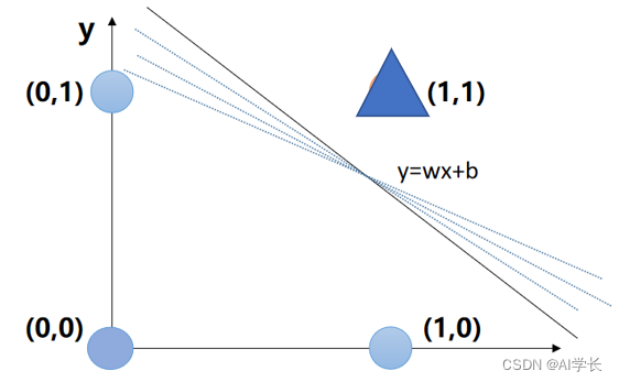 class AndGateModel():def __init__(self):""" 初始化权重、偏置 """self.w = np.random.normal(size=2) # 与门有2个权重self.b = np.random.normal(size=1) # 1个偏置[0.5]self.lr = 0.1 # 学习率(超参数)def forward(self, x):"""前向计算x -- [x1, x2]1. y=wx + b2. 激活函数计算"""y = x[0]*self.w[0] + x[1]*self.w[1] + self.b[0]if y >= 0:return 1else:return 0def train(self, X, Y):"""X,Y -- 训练集"""for i in range(1000): # 迭代j = 0C = 0for xi in X:yi = self.forward(xi) # 前向计算# 计算误差Ci = np.power((Y[j] - yi), 2) / 2C += Ci# 更新权重跟偏置if Ci > 0:self.w[0] = self.w[0] + self.lr * (Y[j] - yi) * xi[0]self.w[1] = self.w[1] + self.lr * (Y[j] - yi) * xi[1]self.b[0] = self.b[0] + self.lr * (Y[j] - yi)j += 1print("epoch{} 误差:{} 权重:{} 偏置:{}".format(i, C, self.w, self.b))# 什么时候退出?if C <= 0:print("=== 与门的4数据都正确了, 退出迭代")break