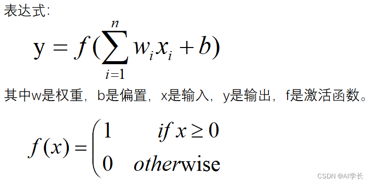 激活函数f是一个阶跃函数(结果是简单的二分类0/1),其表达式: