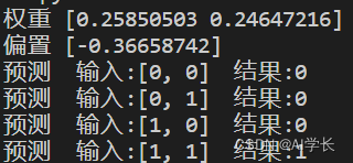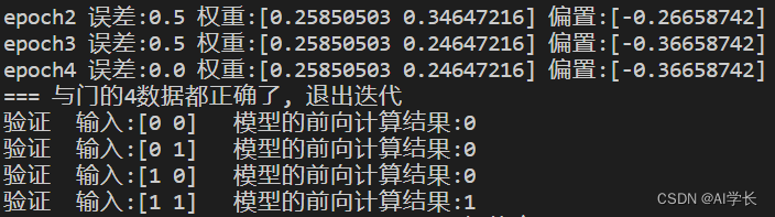 if __name__ == "__main__":# 训练import data_managerX, Y = data_manager.get_xy_data() # 读取数据集model = AndGateModel() # 实例化类对象model.train(X, Y) # 执行训练# 验证训练结果是否正确for xi in X:print("验证 输入:{} 模型的前向计算结果:{}".format(xi, model.forward(xi)))# 保存模型参数np.savez("./params", model.w, model.b)