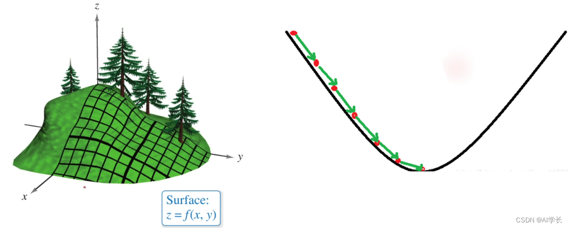 假设场景:一个人被困在山上,需要从山上下来(找到山的最低点,山谷)。但此时山上的浓雾很大,导致可视度很低;因此,下山的路径就无法确定,必须利用自己周围的信息一步一步地找到最快下山的路。