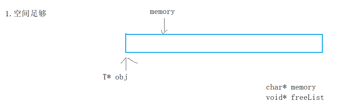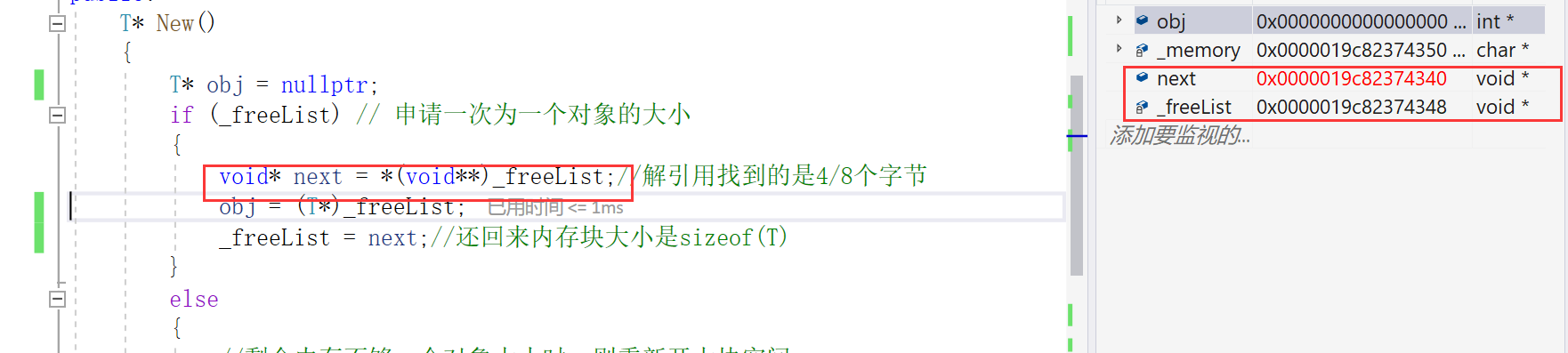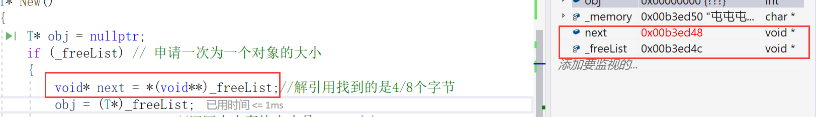 {T* obj = nullptr;if (_freeList) // 申请一次为一个对象的大小{void* next = *(void**)_freeList;//解引用找到的是4/8个字节obj = (T*)_freeList;_freeList = next;//还回来内存块大小是sizeof(T)}else{//剩余内存不够一个对象大小时,则重新开大块空间if (_remainBytes < sizeof(T)){_remainBytes = 128 * 1024;_memory = (char*)malloc(_remainBytes);if (_memory == nullptr){throw std::bad_alloc();}}obj = (T*)_memory;size_t objSize = sizeof(T) < sizeof(void*)? sizeof(void*) : sizeof(T);//指针的大小 至少能够存下一个指针_memory += objSize;_remainBytes -= objSize;}new(obj)T;//定位new,显示调用T的构造函数初始化return obj;