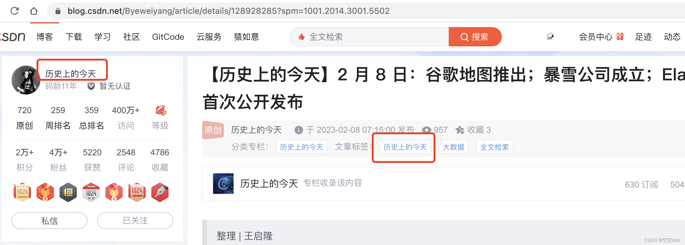 策略说明:用户byeweiyang当日发布的带【历史上的今天】标签的🔥博客。
