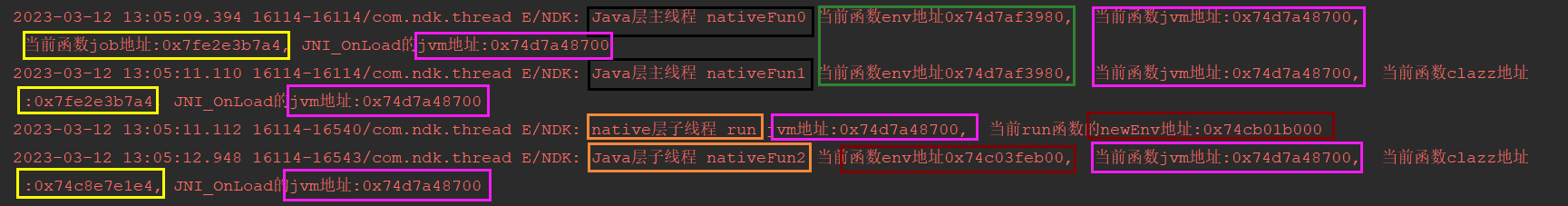 Java_com_ndk_thread_MainActivity_nativeFun2(JNIEnv *env, jobject thiz) {JavaVM *javaVm = nullptr;env->GetJavaVM(&javaVm);// 打印:当前函数env地址, 当前函数jvm地址, 当前函数clazz地址, JNI_OnLoad的jvm地址LOGE("Java层子线程 nativeFun2 当前函数env地址%p, 当前函数jvm地址:%p, 当前函数clazz地址:%p, JNI_OnLoad的jvm地址:%p\n",env,javaVm, thiz, ::java_vm);