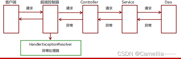 系统中异常包括两类:预期异常和运行时异常RuntimeException,前者通过捕获异常从而获取异常信息,后 者主要通过规范代码开发、测试等手段减少运行时异常的发生。 系统的Dao、Service、Controller出现都通过throws Exception向上抛出,最后由SpringMVC前端控制器交 由异常处理器进行异常处理,如下图