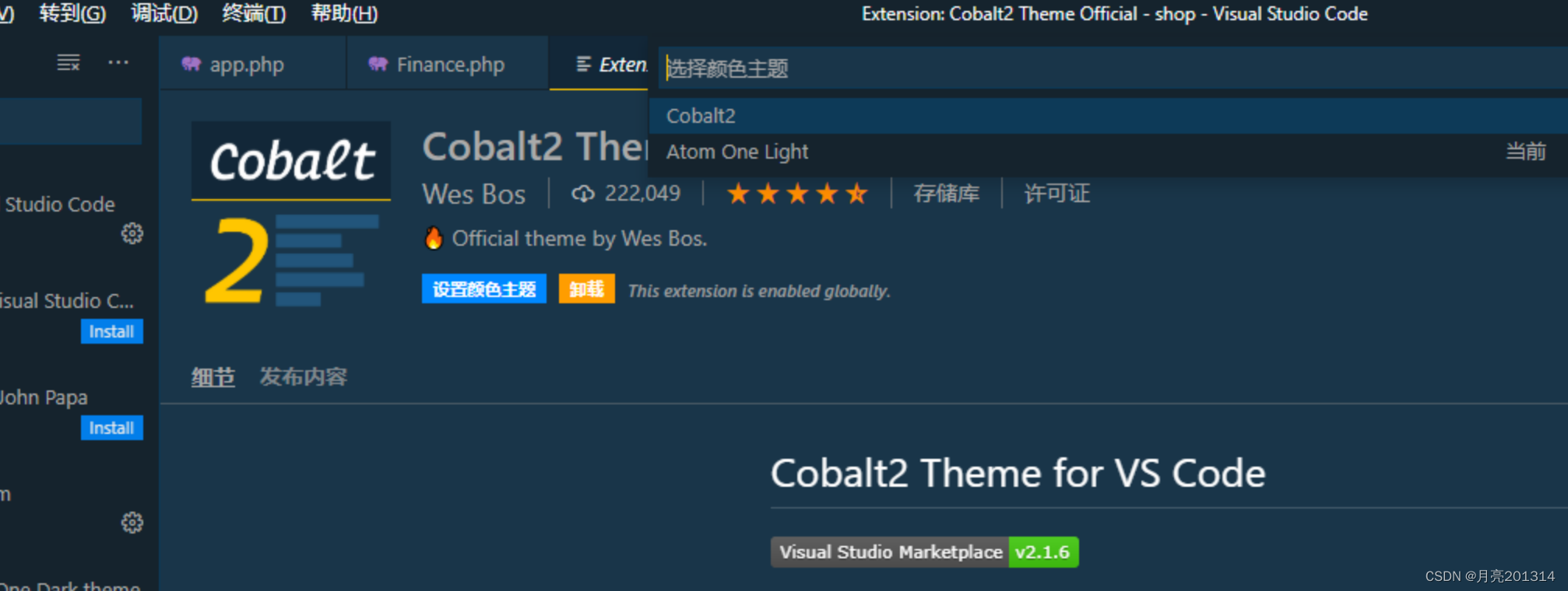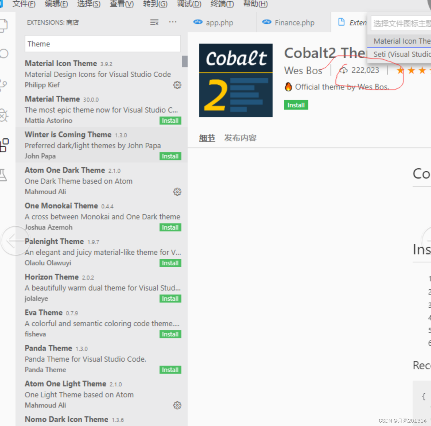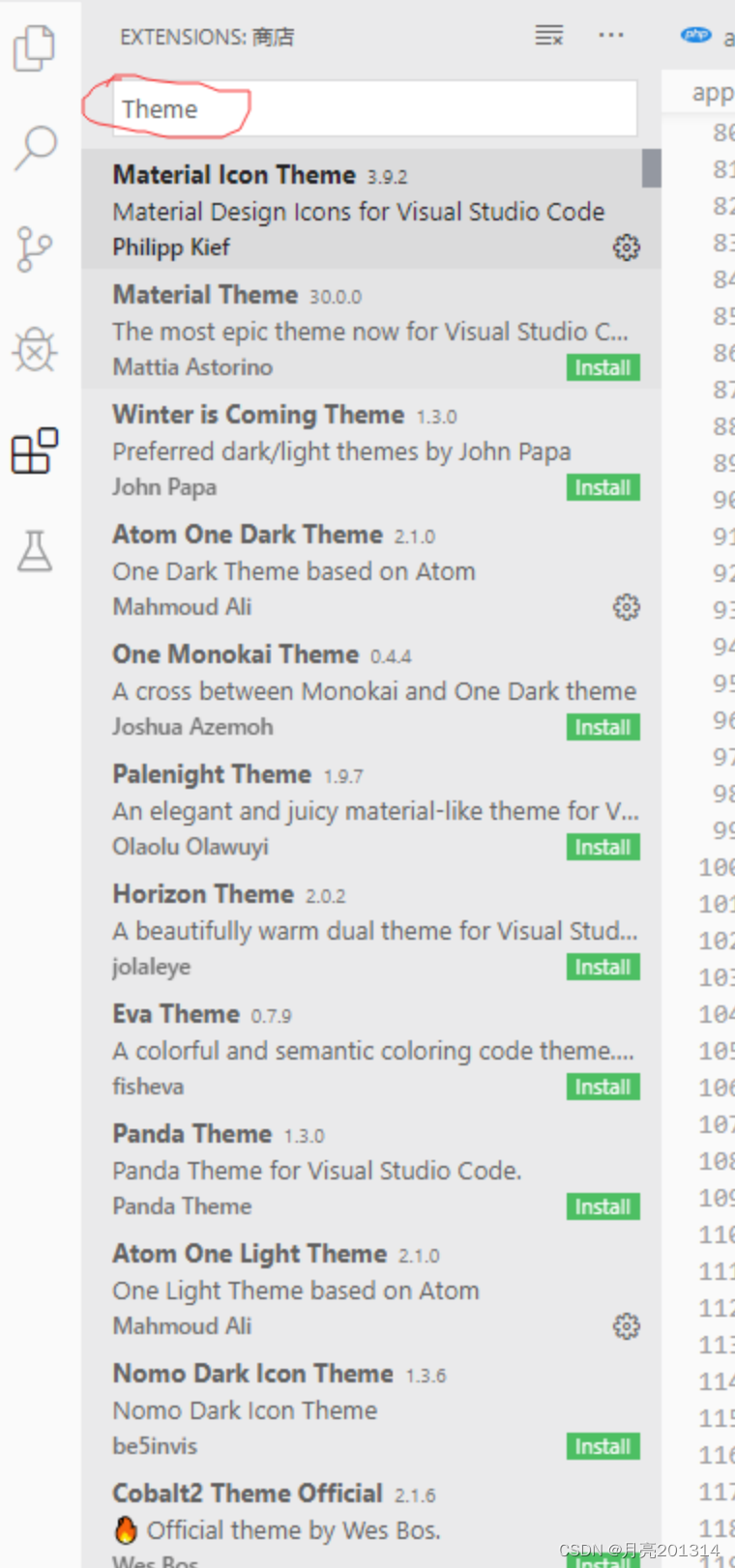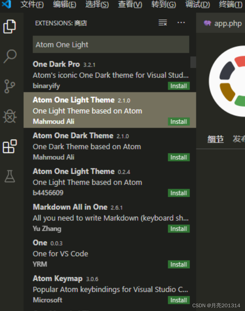 跟下载插件一样,还是在那里搜索,我们就搜索“Atom One Light”,下载这个主题,或者我们搜索“Theme”,搜索其他的主题,如下