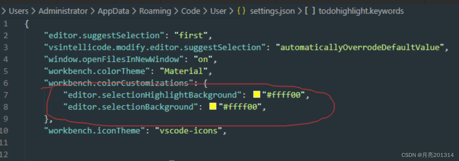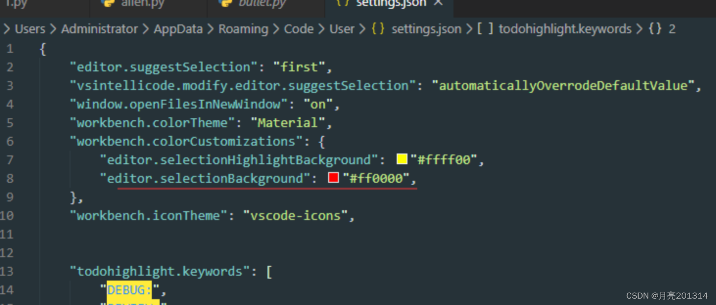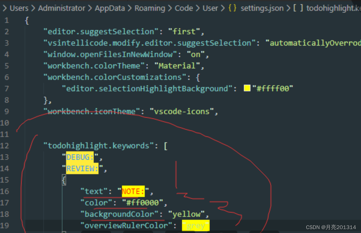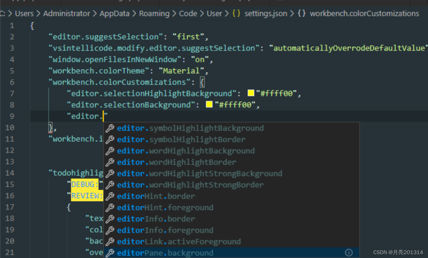 {"editor.suggestSelection": "first","vsintellicode.modify.editor.suggestSelection": "automaticallyOverrodeDefaultValue","window.openFilesInNewWindow": "on","workbench.colorTheme": "Material","workbench.colorCustomizations": {"editor.selectionHighlightBackground": "#ffff00","editor.selectionBackground": "#ffff00",},"workbench.iconTheme": "vscode-icons","todohighlight.keywords": ["DEBUG:","REVIEW:",{"text": "NOTE:","color": "#ff0000","backgroundColor": "yellow","overviewRulerColor": "grey"},{"text": "HACK:","color": "#000","isWholeLine": false,},{"text": "TODO:","color": "red","border": "1px solid red","borderRadius": "2px", //NOTE: using borderRadius along with `border` or you will see nothing change"backgroundColor": "rgba(0,0,0,.2)",//other styling properties goes here ... }],