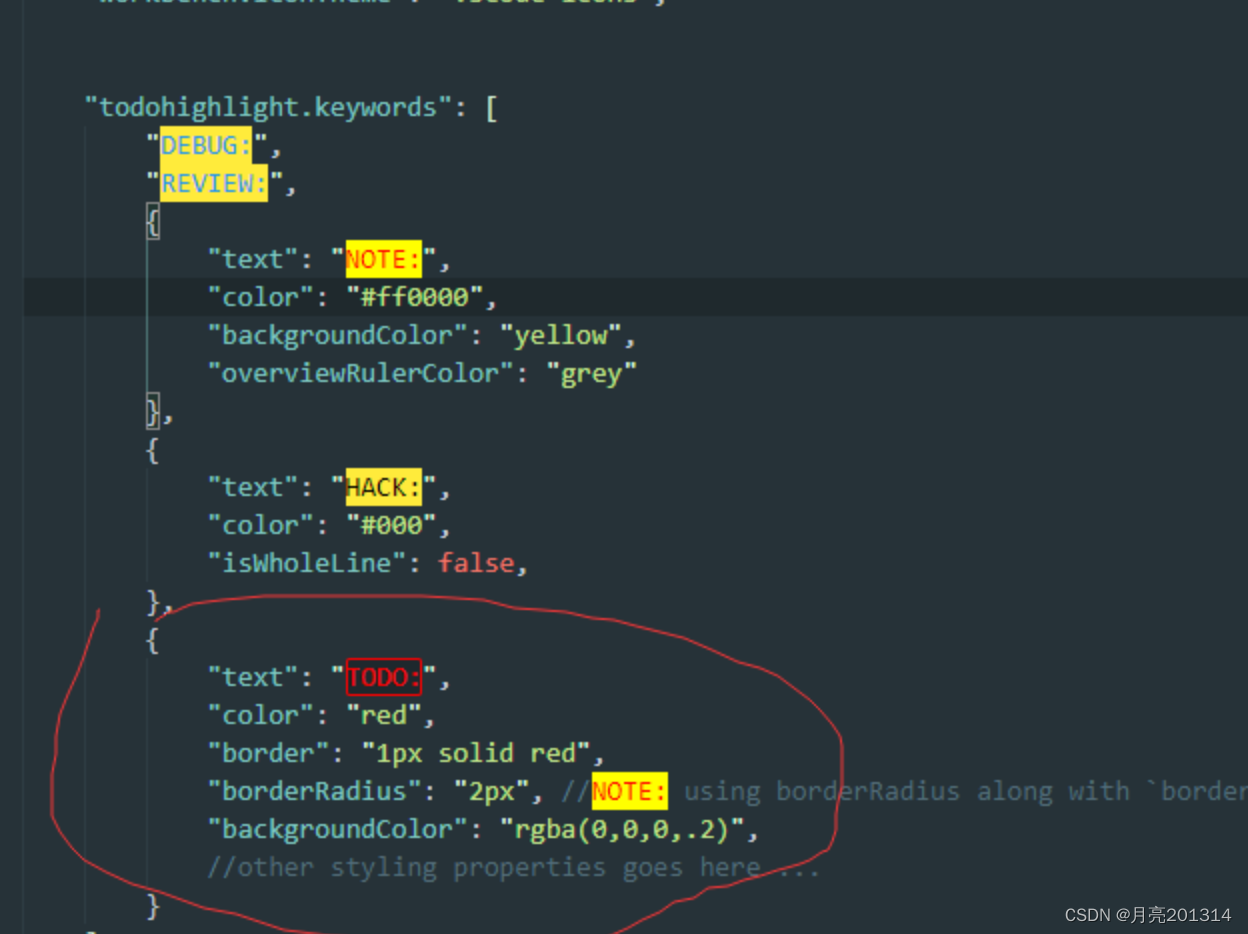 比如我们想我们的代码中如果出现了“NOTE:”,我们就设置它高亮,高亮的样式如下设置,如下