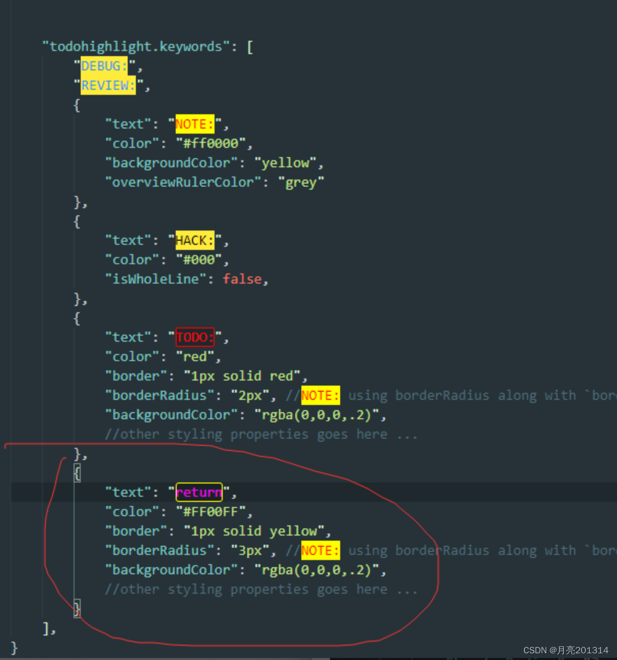 上面我们设置的是“TODO:”这个字符串的高亮样式,然后我们在代码中输入“NOTE:”看看,如下