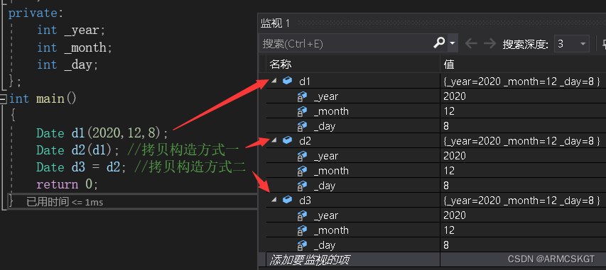 //日期类示例 class Date { public:Date(int year = 1900, int month = 1, int day = 1){_year = year;_month = month;_day = day;}// Date(const Date& d) // 正确写法Date(const Date& d) // 错误写法:编译报错,会引发无穷递归{_year = d._year;_month = d._month;_day = d._day;} private:int _year;int _month;int _day; };int main() {Date d1;Date d2(d1); //拷贝构造方式一Date d3 = d2; //拷贝构造方式二return 0; }