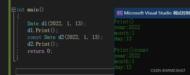 class Test {void Fun() const //将const加在函数参数后即可{//函数方法} };//设想以下日期类代码的运行结果 class Date { public:Date(int year, int month, int day){_year = year;_month = month;_day = day;}void Print(){cout << "Print()" << endl;cout << "year:" << _year << endl;cout << "month:" << _month << endl;cout << "day:" << _day << endl << endl;}void Print() const{cout << "Print()const" << endl;cout << "year:" << _year << endl;cout << "month:" << _month << endl;cout << "day:" << _day << endl << endl;} private:int _year; // 年int _month; // 月int _day; // 日 };int main() {Date d1(2022, 1, 13);d1.Print();const Date d2(2022, 1, 13);d2.Print();return 0; }代码运行结果 总之,const修饰this指针可以起到权限平移的作用!
