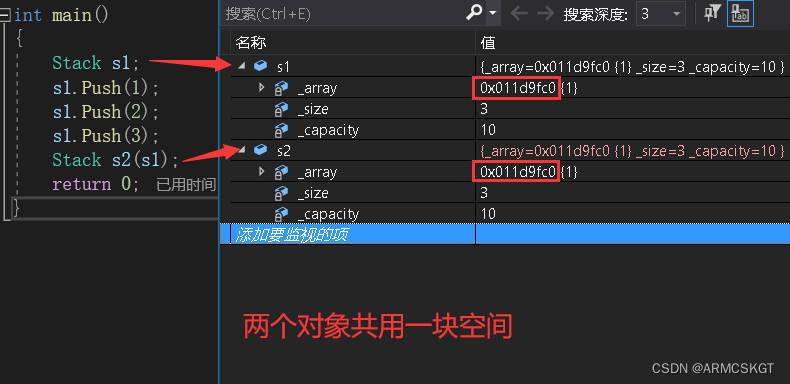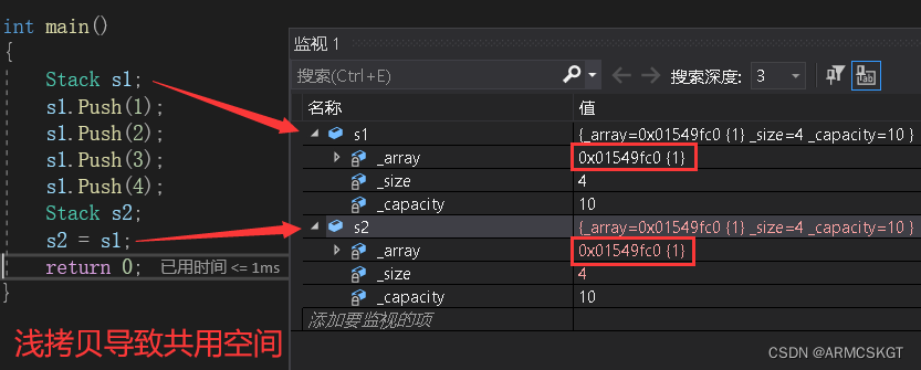 //栈对象 - 猜猜是否会发生与拷贝构造相同的问题 typedef int DataType; class Stack { public:Stack(size_t capacity = 10){_array = (DataType*)malloc(capacity * sizeof(DataType));if (nullptr == _array){perror("malloc申请空间失败");return;}_size = 0;_capacity = capacity;}void Push(const DataType& data){// CheckCapacity();_array[_size] = data;_size++;}~Stack(){if (_array){free(_array);_array = nullptr;_capacity = 0;_size = 0;}} private:DataType* _array;size_t _size;size_t _capacity; };int main() {Stack s1;s1.Push(1);s1.Push(2);s1.Push(3);s1.Push(4);Stack s2;s2 = s1;return 0; }