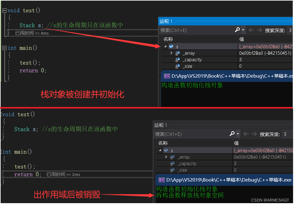 //析构函数定义 class Test {~Test() {//释放方法} };//简易栈对象 typedef int DataType; class Stack { public:Stack(size_t capacity = 3){_array = (DataType*)malloc(sizeof(DataType) * capacity);if (NULL == _array){perror("malloc申请空间失败!!!");return;}_capacity = capacity;_size = 0;cout << "构造函数初始化栈对象" << endl;}void Push(DataType data){// CheckCapacity();_array[_size] = data;_size++;}// 其他方法...~Stack(){if (_array){free(_array);_array = NULL;_capacity = 0;_size = 0;}cout << "析构函数释放栈对象空间" << endl;} private:DataType* _array;int _capacity;int _size; };