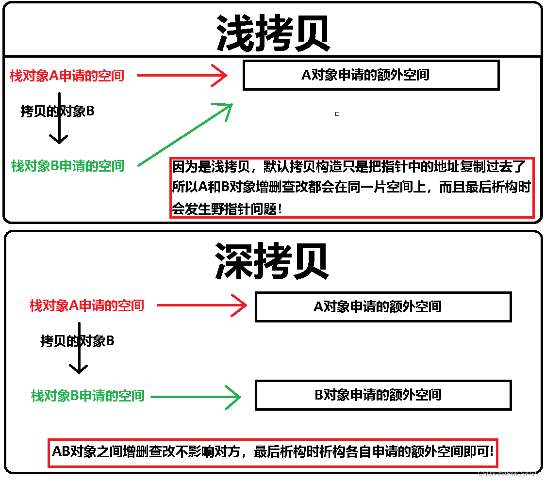浅拷贝只是简单的逐字节拷贝,对于对象内部有空间申请的,会发生共用空间重复析构的情况;而深拷贝是在新对象中开辟一块属于自己的新空间,然后将数据逐一拷贝过来,新旧对象之间的数据相互独立!