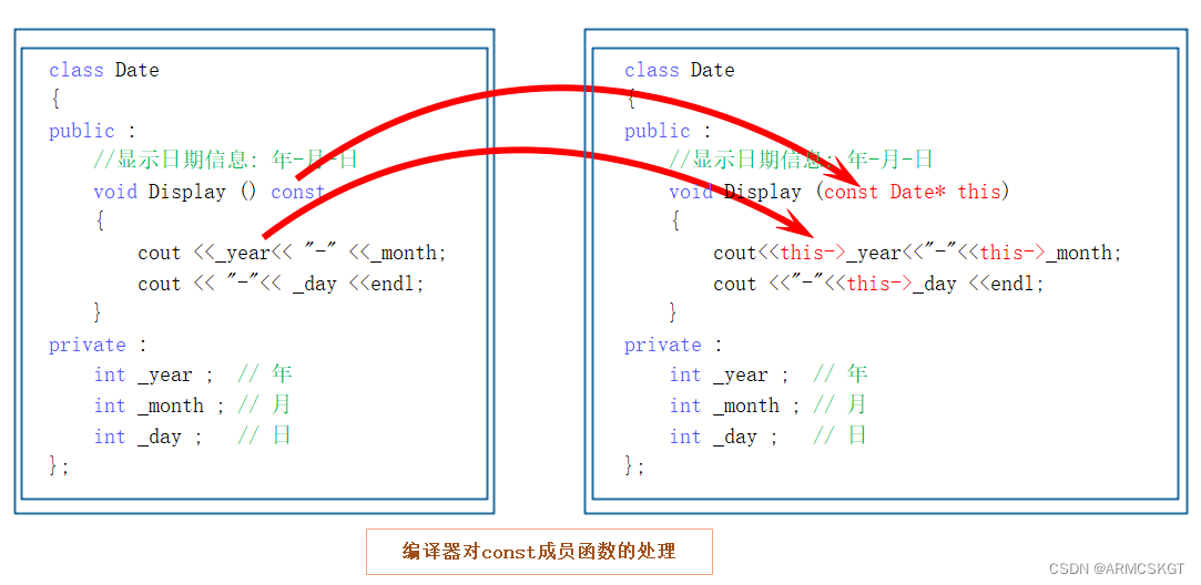 public://构造函数Date(size_t year = 1970, size_t month = 1, size_t day = 1){_year = year;_month = month;_day = day;}//析构函数~Date(){_year = 0;_month = 0;_day = 0;}//拷贝构造函数(简称:拷贝构造)Date(const Date& d){_year = d._year;_month = d._month;_day = d._day;}//赋值重载函数(赋值运算符重载)Date& operator=(const Date& d){_year = d._year;_month = d._month;_day = d._day;return *this;}//取地址运算符重载Date* operator&(){return this;}//const返回取地址运算符重载,const修饰thisconst Date* operator&() const{return this;}private:size_t _year;size_t _month;size_t _day;};