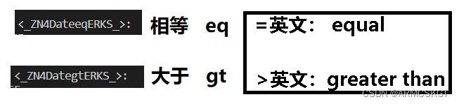 如果定义在类中在Linux环境下修饰规则为:_ZN4D+类名+运算符英文简称+ERKS_