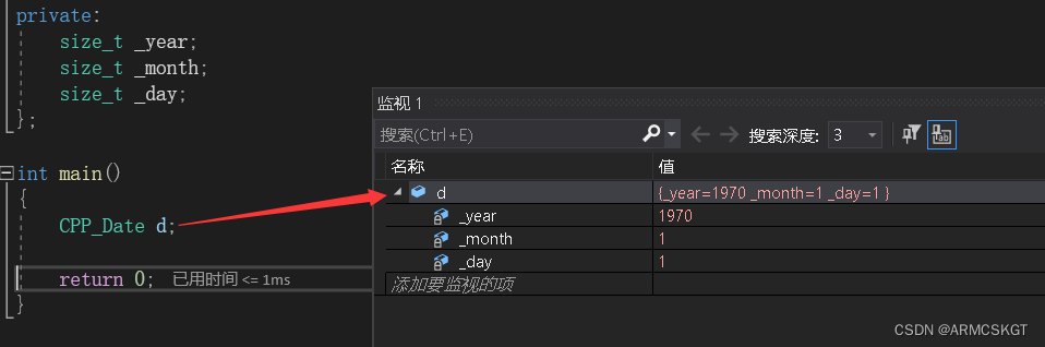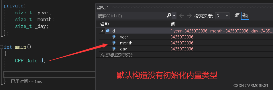 //C++实现日期类 class CPP_Date //日期对象 { public://无参构造函数//CPP_Date()//{// _year = 0;// _month = 0;// _day = 0;//}//全缺省默认构造CPP_Date(size_t year = 1970, size_t month = 1, size_t day = 1){_year = year;_month = month;_day = day;}//当存在两种实例化相同的构造方法时,只能存在一种,否则在调用时会出错!//例如 (CPP_Date d;) 编译器无法判断d对象调用的是哪一个构造函数private:size_t _year;size_t _month;size_t _day; };自定义默认构造完成内置类型的初始化