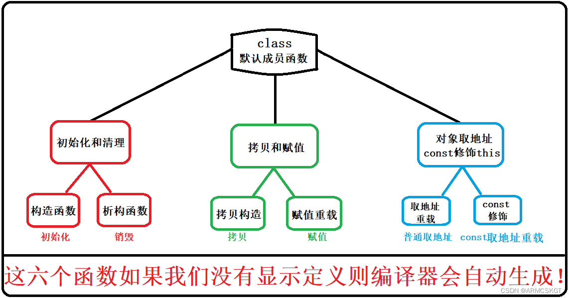 函数 功能 重要性 构造函数 定义和初始化成员变量 重要 析构函数 释放申请的内存空间(销毁成员变量) 重要 拷贝构造(函数) 实现对象间的深拷贝 重要 赋值重载(函数) 实现对象间的深赋值 重要 取地址重载(函数) 自定义类对象取地址操作符功能 一般 const取地址重载(函数) 自定义对象取地址操作符功能const修饰返回的地址 一般 这些函数我们不写,编译器也会自己写一个默认的函数代替对应函数!