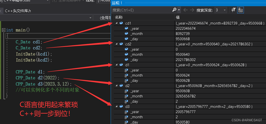 可以发现C++中类融入构造函数后只需要实例化对象就能同时完成初始化,非常方便!而且结合C++的缺少参数,函数重载等新特性,可以让初始化丰富多样,增强程序可用性!