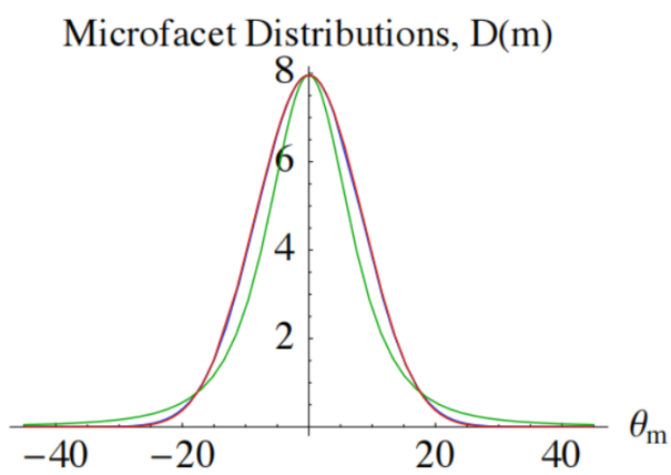 GGX相较于Beckmann分布和Blinn-Phong分布有更长的拖尾,如下图,表达了三个法线分布函数关于微观法线与宏观法线夹角关系的图像: