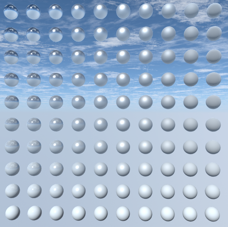 在实际应用中对于某一直接照射到物体表面的光源(往往是方向光源)而言,仅仅计算从该方向照射过来的光照即可。我们将金属度和粗糙度在[0,1]之间插值,设置颜色为蓝色,得到100个小球的渲染结果: