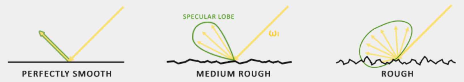 如果仅仅只是半球上的随机采样的话,对于纯Diffuse表面来说是堪用的(因为Diffuse的出射Radiance本来就是向四周均匀散射的)。对于Specular表面而言却是不合适的,这是由于Specular表面的粗糙度相较于Diffuse而言要小,这导致当一束Radiance射入表面时,受到微表面的粗糙度影响,光线折射的光瓣也与Diffuse表面不同: