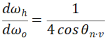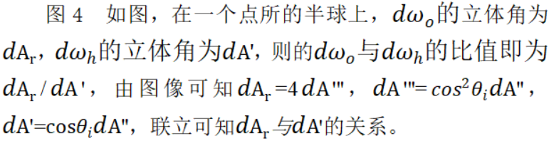 既然h为l与v的半向量,则h与l的夹角等价于h与v的夹角,二者是一样的。那么,化简BRDF的关键因素就是立体角微元dωh与dωo的比值了,该值可以用下图的关系推导出来: