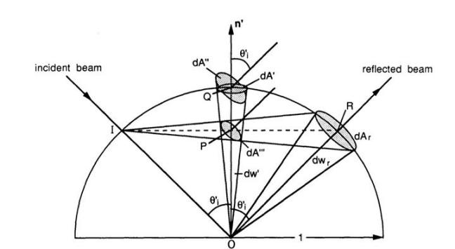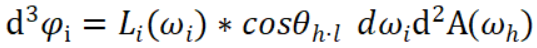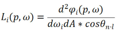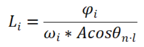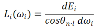 假设光照入射方向与该点法线的夹角为θ(n·l),存在该面积A的单位半球朝向入射方向上的立体角ωi的辐亮度(Radiance)为: